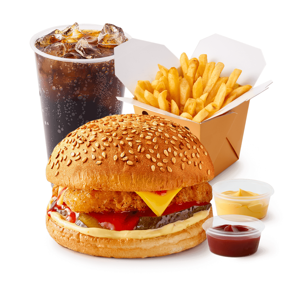 Бургер куриный острый «Из Лавки» + Большая порция Картофель фри с сырным соусом и кетчупом «Из Лавки» + Напиток Лимонад Coca-Cola со льдом «Из Лавки», 370 ml