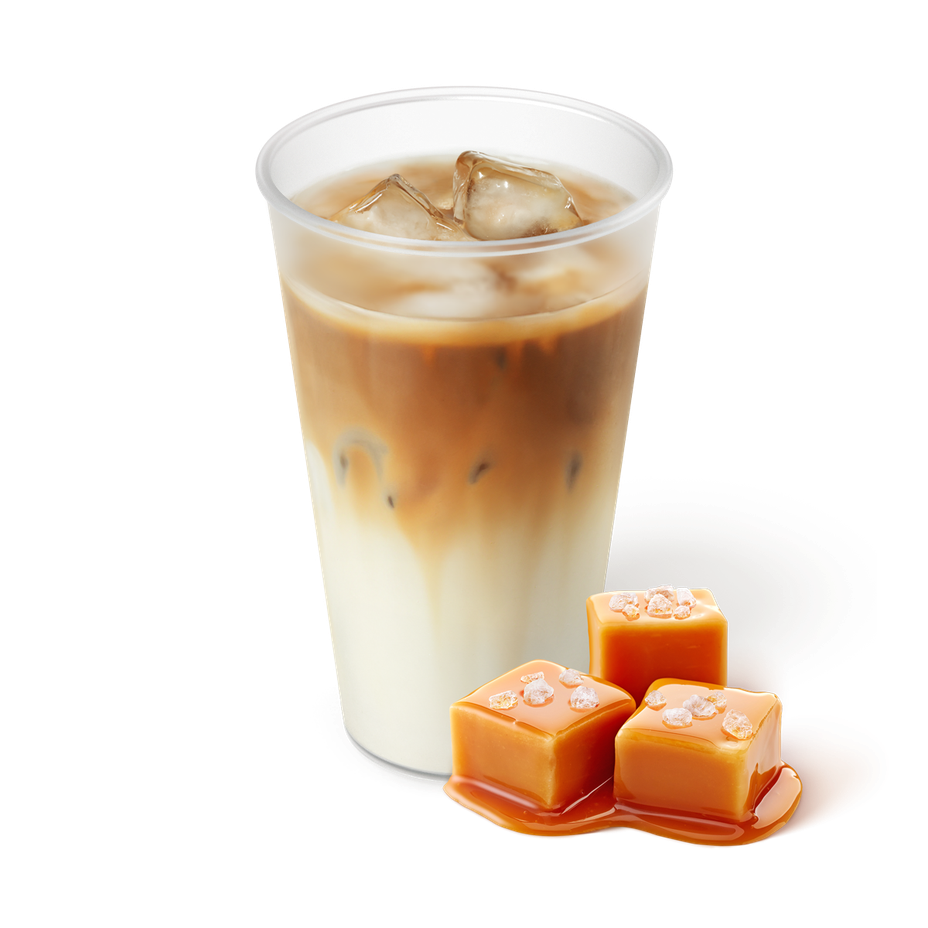 Этот холодный латте готовят с сиропом солёной карамели и ультрапастеризованным молоком. В нём сочетаются кофе арабика и лёгкая сладость карамели.