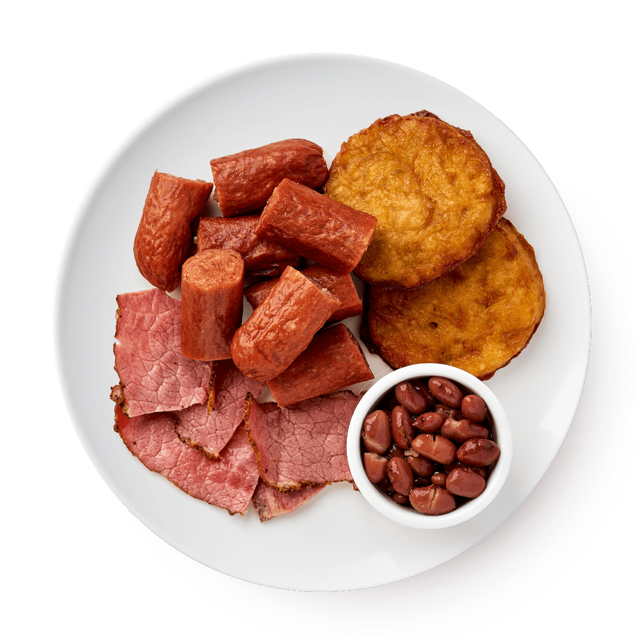 Этот завтрак включает драники, сосиску и фасоль в томатном соусе. Его можно разогреть в микроволновке или съесть сразу.