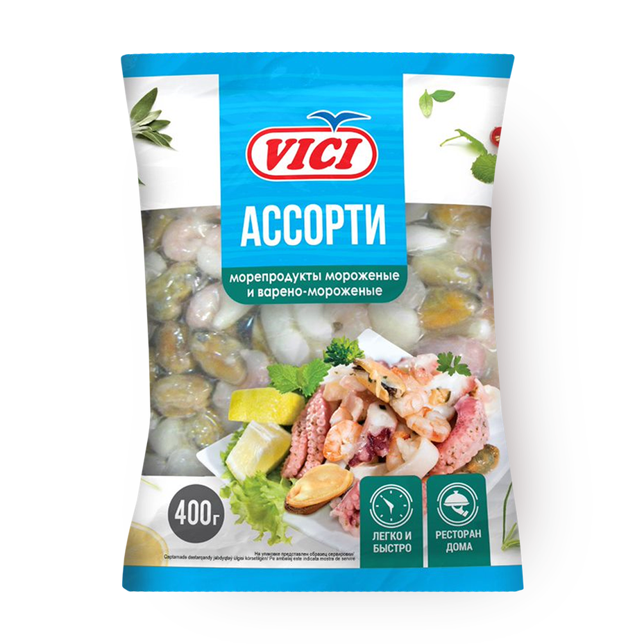 кальмар гигантский (Dosidicus gigas) филе-кусочки, щупальца мороженый (содержит: регуляторы кислотности – лимонная кислота, цитраты натрия, гидрокарбонат натрия; агент влагоудерживающий - полифосфаты), район вылова: Тихий океан, Северо-Запад; мидии обыкновенные (Mytilus edulis) мясо варёно-мороженые; осьминог японский четырёхглазый (Octopus ocellatus) кусочки мороженый, район вылова: Тихий океан, Северо-Запад; креветки клыкастые илистые (Solenocera melantho) очищенные мороженые (содержат: агент влагоудерживающий - полифосфаты, антиокислитель - пиросульфит натрия), район вылова: Тихий океан, Северо-Запад; вода (защитная глазурь).