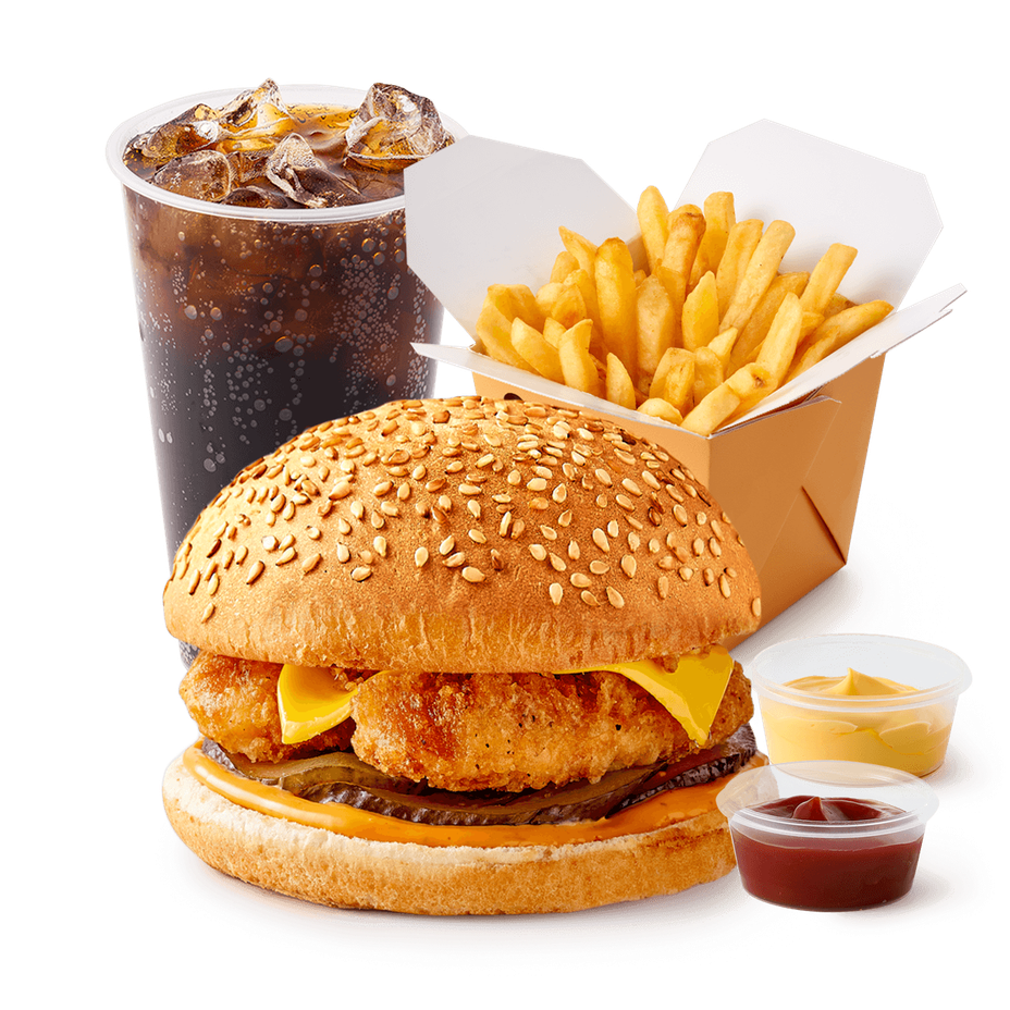 Бургер куриный «Из Лавки» + Большая порция Картофель фри с сырным соусом и кетчупом «Из Лавки» + Напиток Лимонад Coca-Cola со льдом «Из Лавки», 370 ml