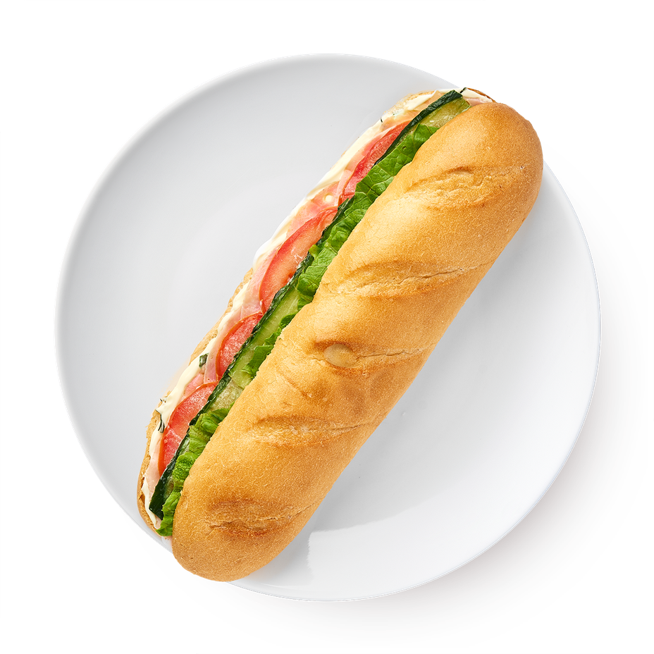 Багет с ветчиной из индейки, свежим огурцом и помидором. В нём сочетаются сочный салат и лёгкий соус с зеленью.