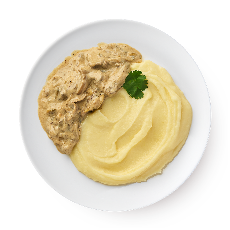 Говядина с грибами и луком в сливочном соусе, которая подаётся с картофельным пюре. Это блюдо можно разогреть в микроволновке или на плите.