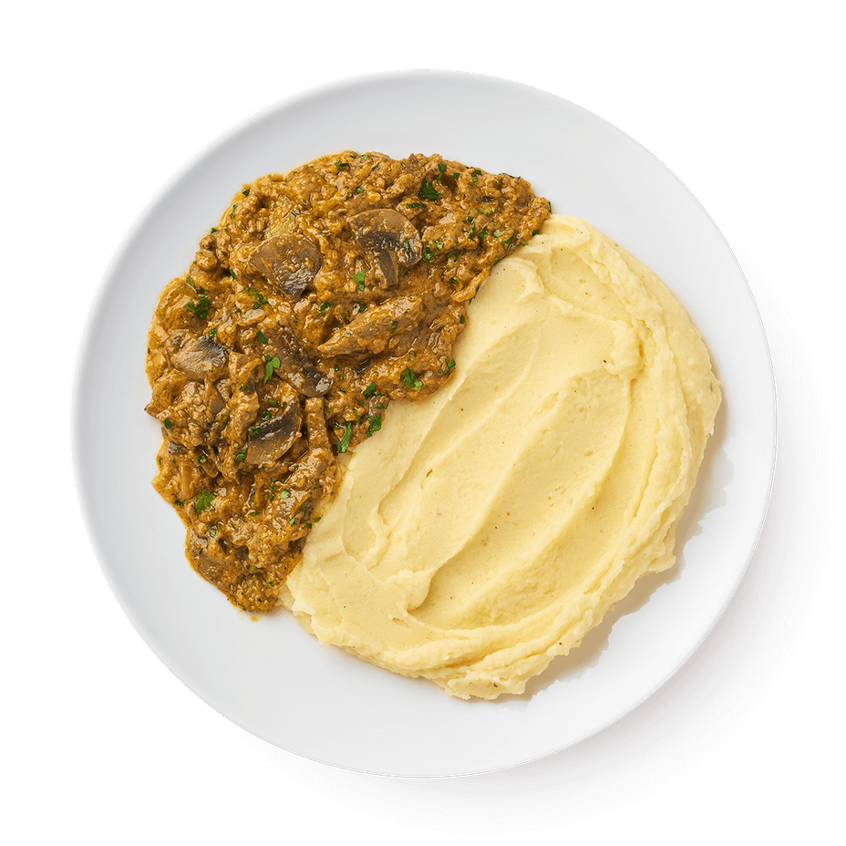 Бефстроганов (телятина мякоть, грибы шампиньоны, лук репчатый, мука пшеничная высший сорт, горчица* дижонская, огурцы корнишоны, соль морская, масло подсолнечное, масло сливочное, перец чёрный молотый, петрушка), пюре картофельное (картофель, соль морская, стебель сельдерея*, лук репчатый, лавровый лист, мускатный орех*, масло сливочное 82% жирности, молоко* 2,5% жирности, сливки* 30% жирности), петрушка.