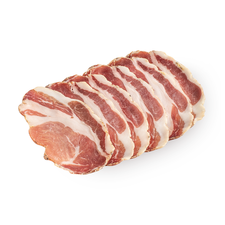 Говяжий бекон с лавандой и чёрным перцем, который коптили по традиционной технологии. Можно добавить в салаты или подать к сырной тарелке.