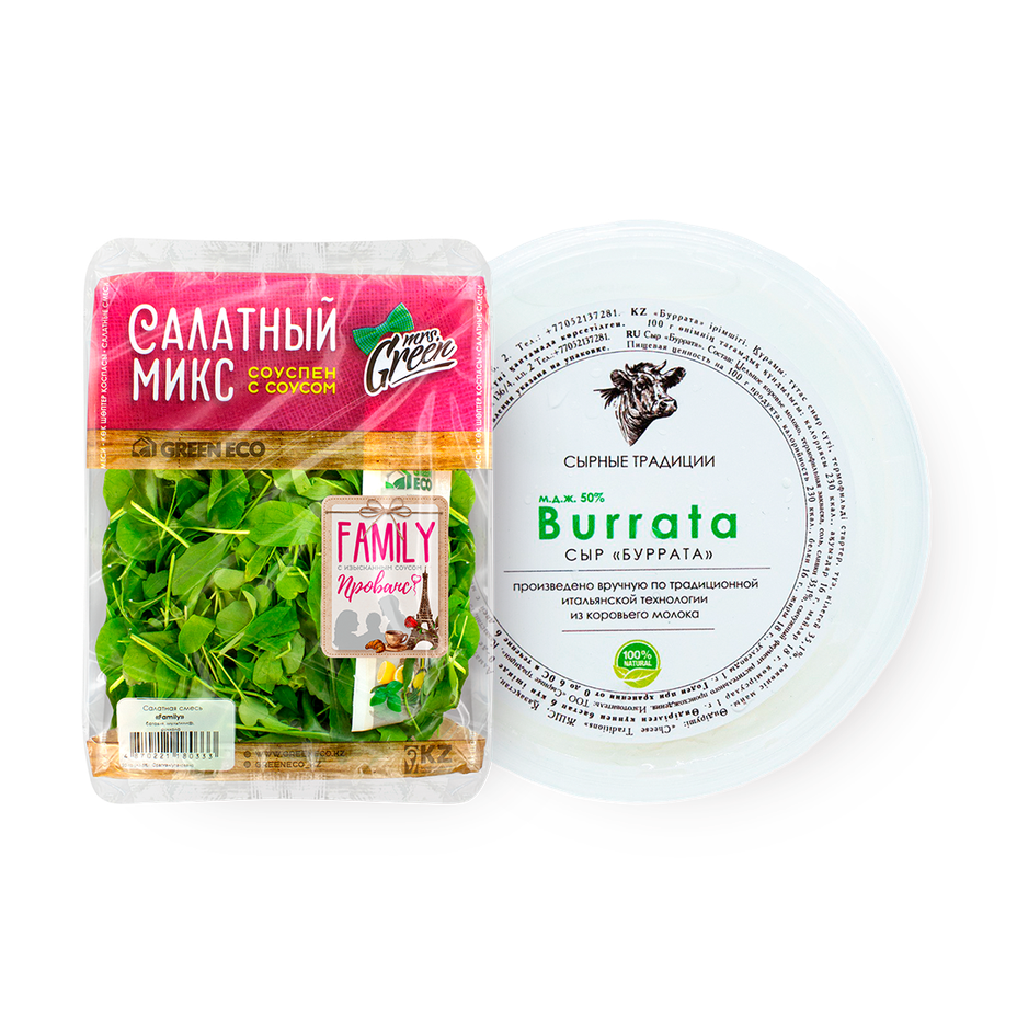 Сыр Буррата «Сырные традиции», 125 g» + Смесь салатная с соусом «Миссис Грин» Семейный, 120 g