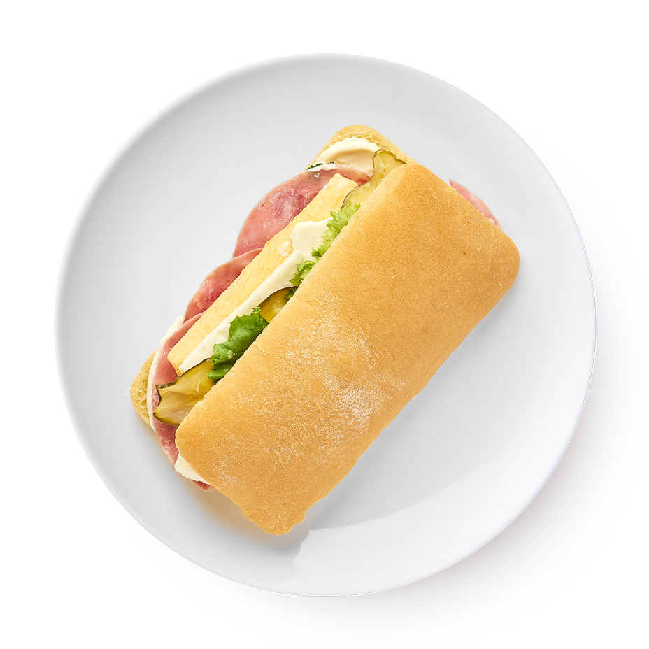 Чиабатта: мука пшеничная высший сорт, улучшитель хлебопекарный, соль пищевая йодированная, масло растительное, начинка: омлет (яйцо куриное, масло растительное, соль пищевая йодированная), ветчина с говядиной, сыр адыгейский, огурец маринованный, сыр плавленый, лист салата, соус: майонез, сыр творожный, концентрат лимонный, лук репчатый, сахар песок, соль пищевая йодированная, петрушка, масло растительное, чеснок.
