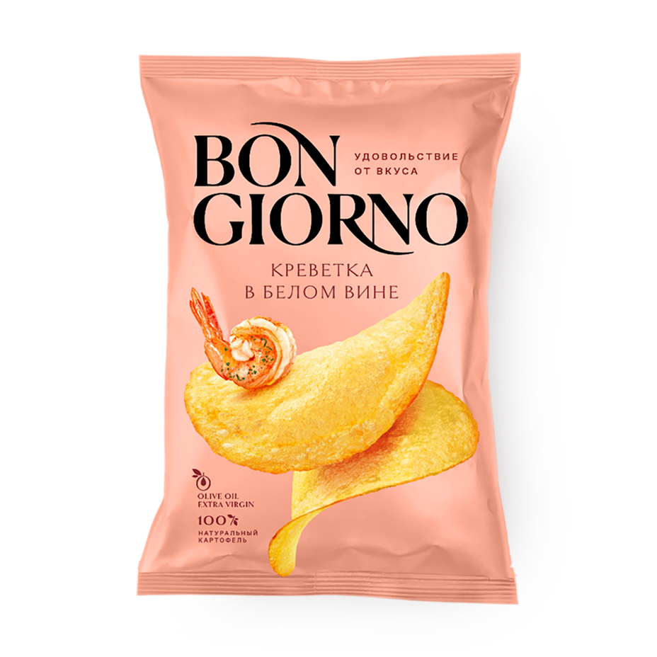 Картофель натуральный, растительные масла (подсолнечное, оливковое), комплексная пищевая добавка «Креветка в белом вине» (мука рисовая, ароматизатор пищевой, соль, усилитель вкуса и аромата глутамат натрия 1- замещенный, сахар, усилители вкуса и аромата (5'-гуанилат натрия 2- замещенный, 5'-инозинат натрия 2-замещенный)).