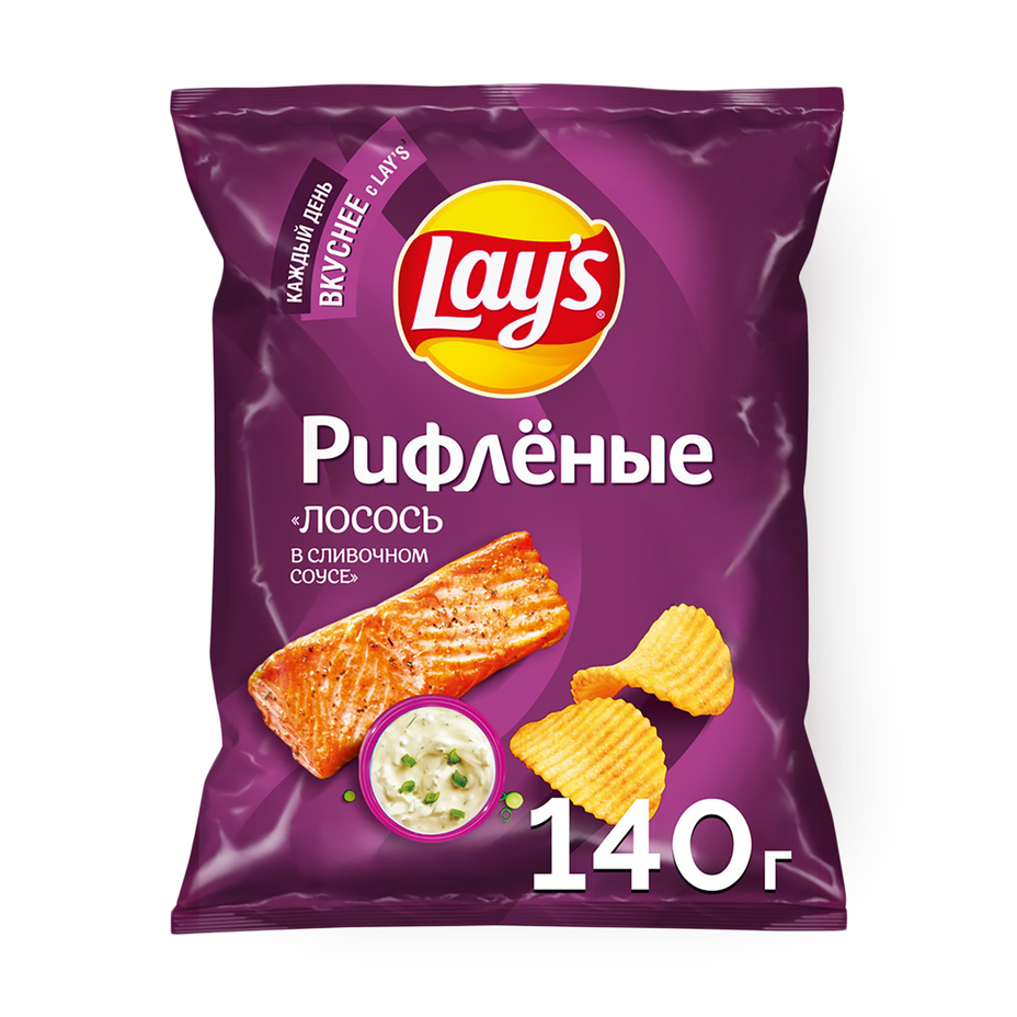 Рифлёные чипсы со вкусом лосося в сливочном соусе напоминают морепродукты. Их удобно взять с собой в качестве перекуса.