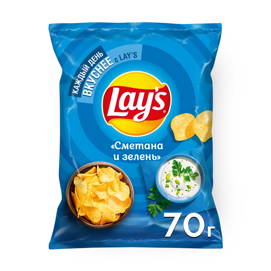 Хрустящие картофельные чипсы со вкусом сметаны и зелени. Их можно взять с собой на прогулку или использовать в качестве перекуса.