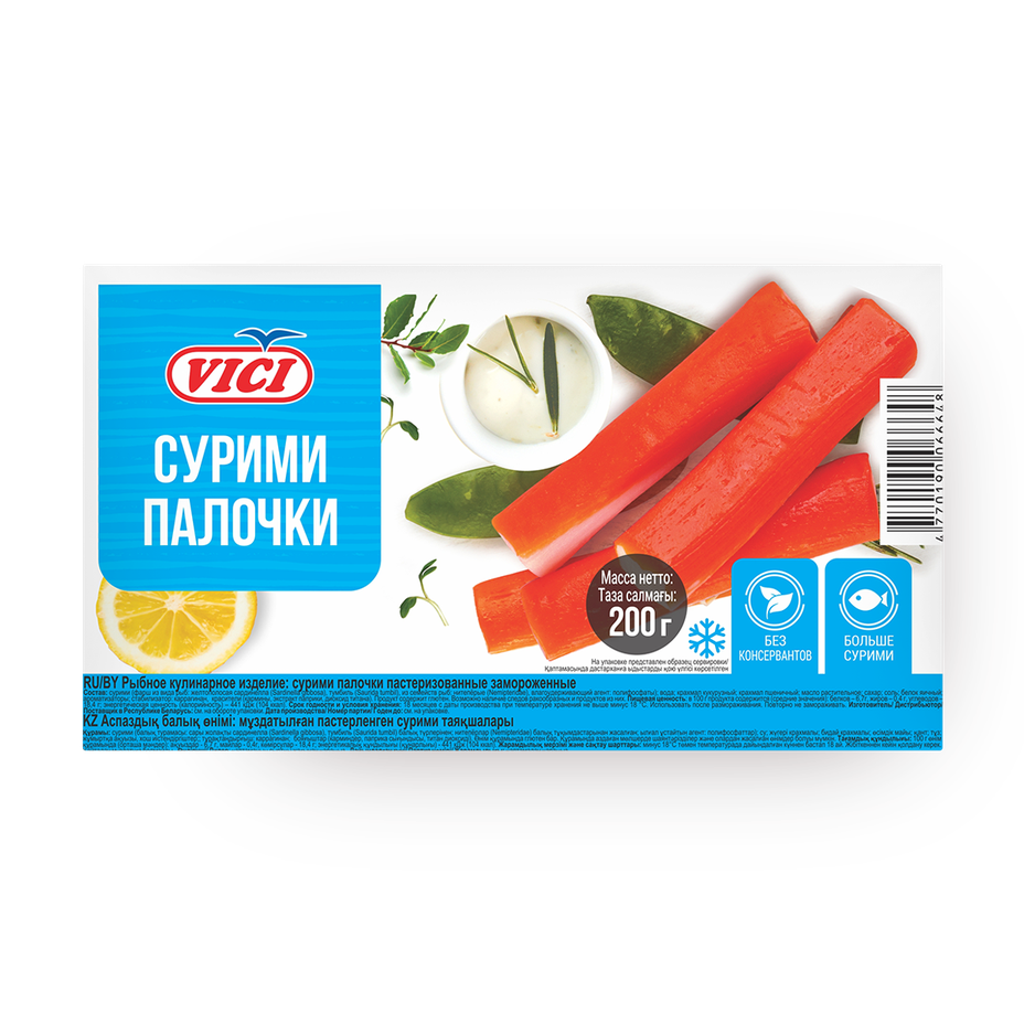 Сурими (фарш рыбный из зоологических видов рыб: красный нитепер (Nemipterus japonicus), желтополосая сардинелла (Sardinella gibbosa) ; влагоудерживающий агент: полифосфаты) ; вода; крахмал кукурузный; крахмал пшеничный; масло растительное; сахар; соль; белок яичный; ароматизаторы; стабилизатор: каррагинан; красители (кармины, экстракт паприки, диоксид титана).