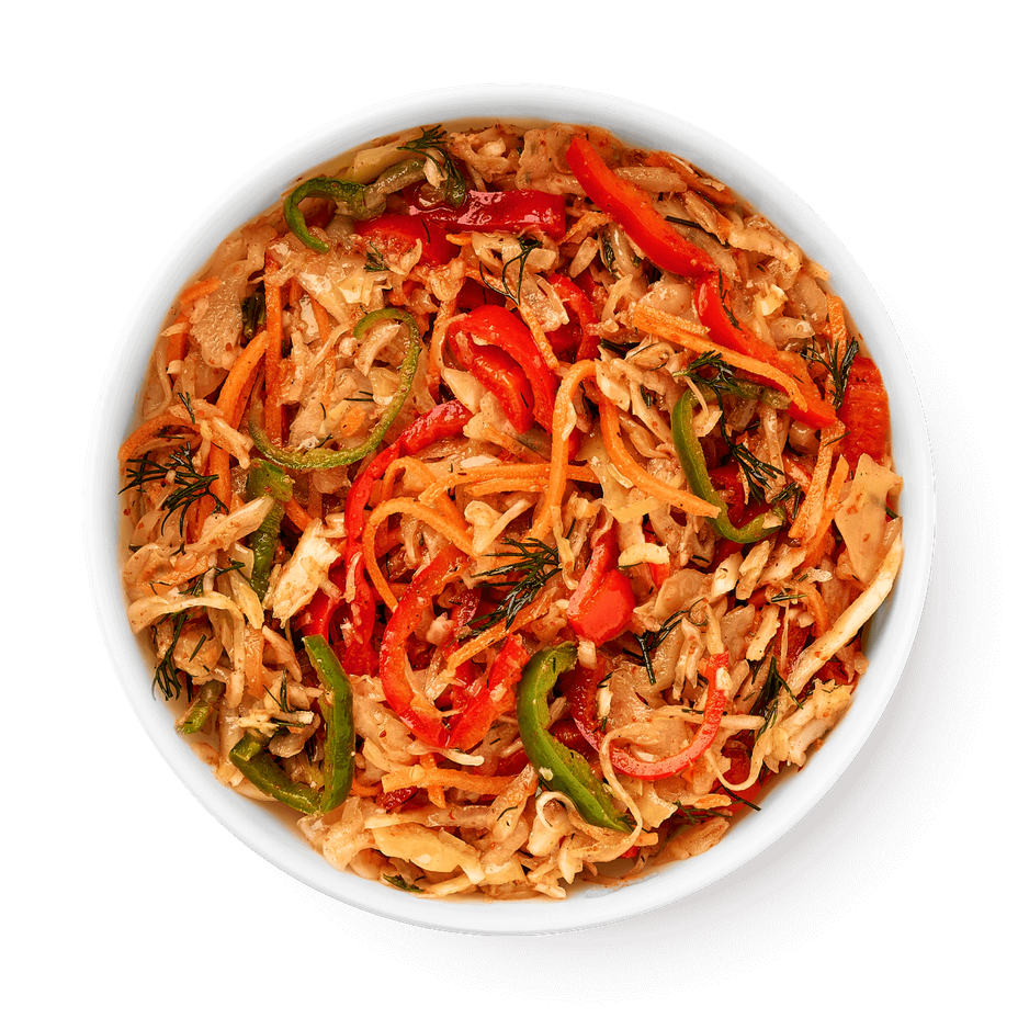 Капуста белокочанная, перец полугорький, морковь, масло подсолнечное, кориандр молотый, чеснок, укроп, уксусная кислота 9%, соль морская, паприка, перец чёрный молотый.