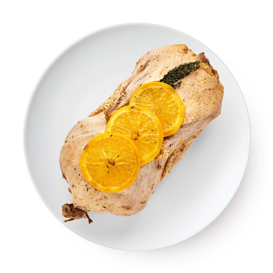 Утка, яблоки, апельсин, соус соевый, горчица, чеснок, соль морская, мёд, перец чёрный молотый.