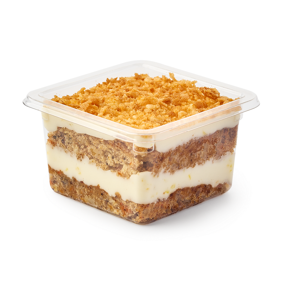 Корж морковный: масло растительное, сахарный песок, яйцо куриное, лимонный сок, сода пищевая, орех грецкий, изюм жёлтый, мука пшеничная, кокосовая стружка, корица молотая, разрыхлитель, орех мускатный, морковь; сироп: цедра лимона, сахар, вода; крем: масло, сыр творожный, пудра сахарная, цедра лимона; вафельная крошка.