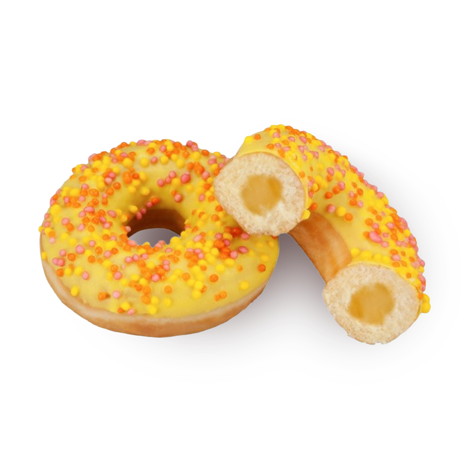 Этот донат с манговой начинкой покрыт жёлтой посыпкой и белым шоколадом. Можно взять с собой в качестве сладкого перекуса или к чаю.