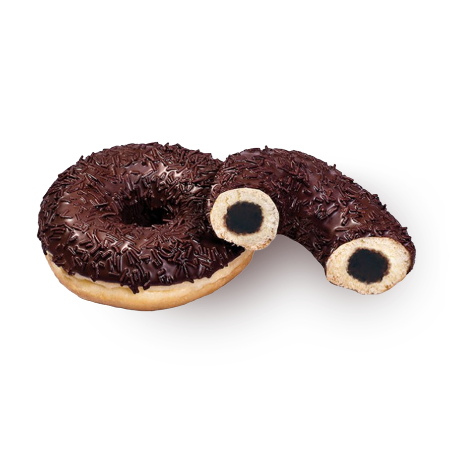 Этот донат покрыт шоколадной глазурью и посыпкой, а внутри у него сливочно-шоколадная начинка. Можно взять с собой на перекус или к чаю.