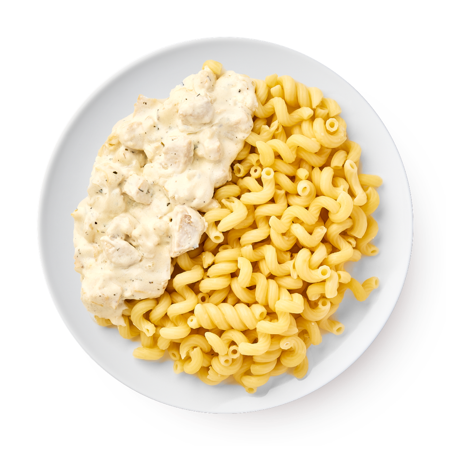 Куриное филе, лук репчатый, сливки 20%, масло растительное, соль, эстрагон, паста фузилли.