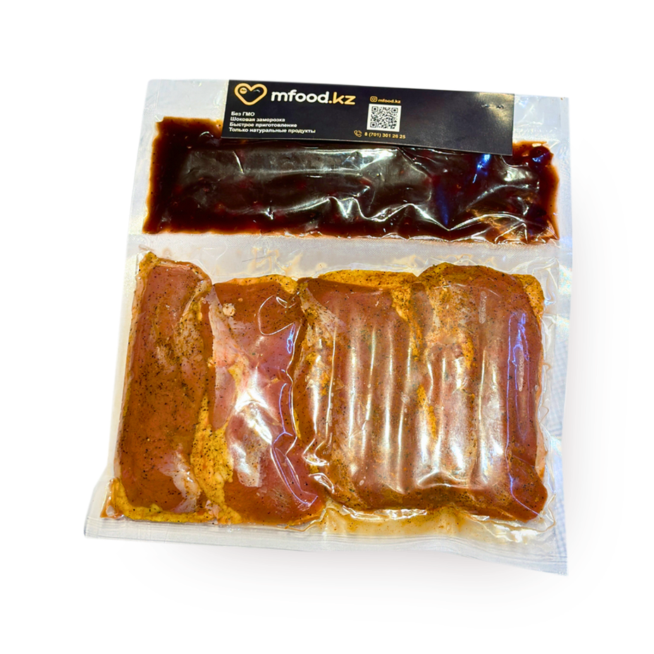 Утиное филе, томатная паста, аджика, соль, перец черный и красный, чеснок, специи, брусничный соус (слива, сахар, соевый соус, крахмал, вино, кетчуп, брусника).