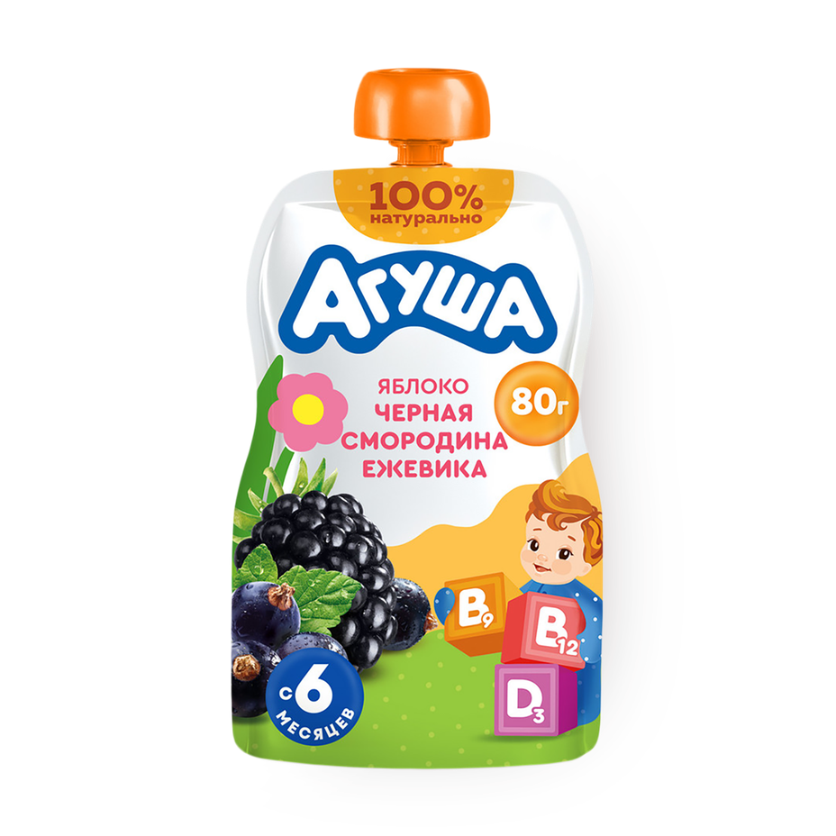 Пюре с яблоком, чёрной смородиной и ежевикой подходит для детей с 6 месяцев. Оно готово к употреблению и не требует дополнительной подготовки.