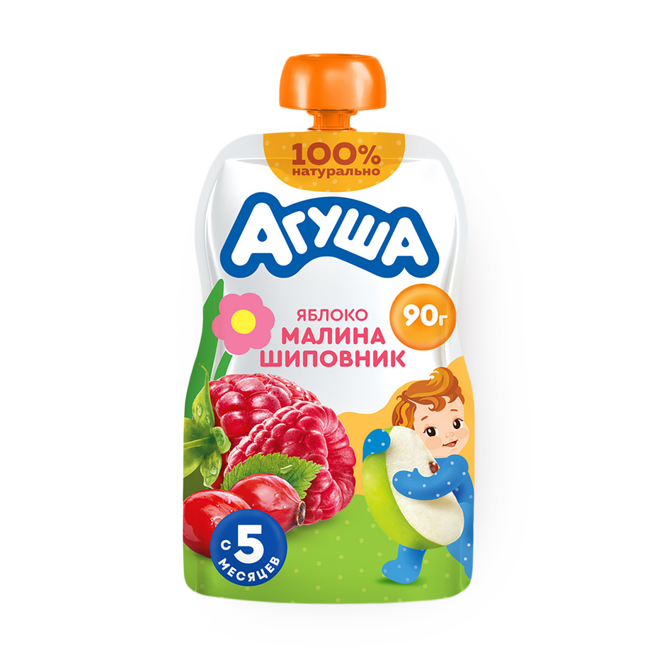 Пюре подходит для малышей с 6 месяцев, в нём сочетаются яблоко, малина и шиповник. Готово к употреблению, не требует приготовления.