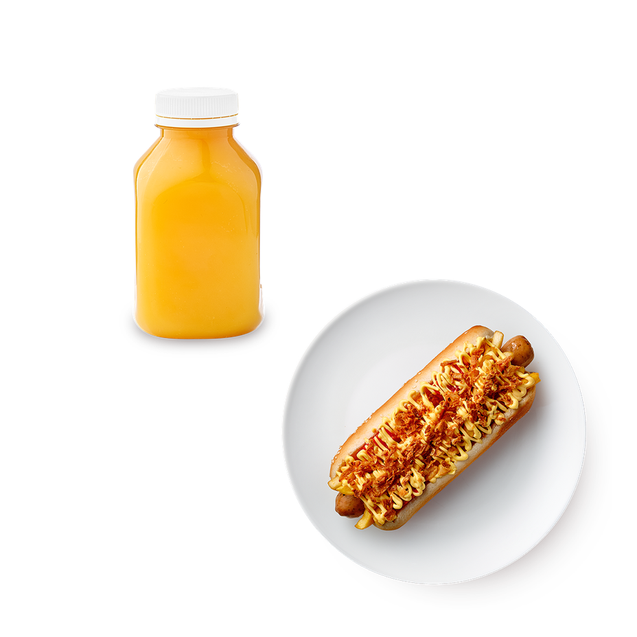 Хот-дог с куриной колбаской, картофелем фри и томатами «Из Лавки», 230 g и Сок апельсиновый «Из Лавки», 320 ml