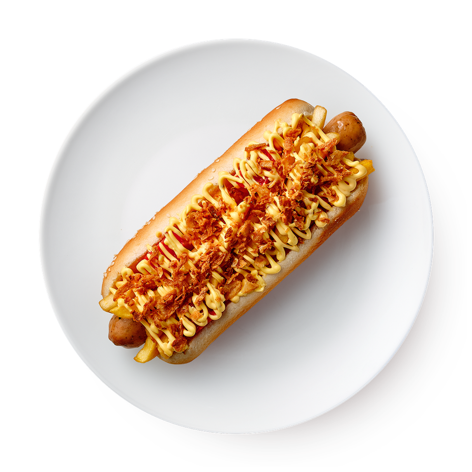 Мука пшеничная хлебопекарная высшего сорта, питьевая вода, сахар-песок, масло рапсовое, семена кунжута, соль поваренная пищевая, дрожжи хлебопекарные сухие инстантные, комплексная пищевая добавка - улучшитель хлебопекарный «Таленто Бан» (мука пшеничная хлебопекарная первый сорт, эмульгаторы (Е472е, Е481), агент антислеживающий Е170, антиокислитель Аскорбиновая кислота, ферментные препараты) глютен пшеничный, консервант Е282, антиокислитель Аскорбиновая кислота. Сосиска: мясо птицы, вода питьевая, нитритно-посолочная смесь (соль пищевая, фиксатор окраски нитрит натрия), специи (петрушка, морковь, пастернак), виноградный сахар, экстракты специй (перец черный, перец белый), пищевые волокна (гороховые, цитрусовые, бамбуковые), глютеносодержащих злаков, яиц, молока, сои, горчицы, сельдерея, мясо продуктивных животных, птицы и продуктов их переработки. Соус: Вода, масло подсолнечное, загуститель Е1422, сахар, яичный желток, уксус столовый, соль. зёрна коричневой горчицы, оболочка горчицы, медовый порошок, специи и пряности (горчичный порошок, мускатный орех, корица, перец чёрный, семена сельдерея, перец белый, куркума, ароматизатор горчицы, регулятор кислотности: молочная кислота, лимонная кислота; краситель каротин, антиокислитель Е385. Вода, сироп глюкозно-фруктозный, томатная паста, уксус столовый, загуститель Е1422, соль, ароматизатор Хикори, натуральный краситель сахарный колер III, лук, перец чили, перец чили копчёный, регулятор кислотности молочная кислота, консервант сорбиновая кислота, подсластитель сахарин (натриевая соль). Огурцы, соль, чеснок, пряности, вода. Говядина, вода, посолочно-нитритная смесь, соль поваренная пищевая, фиксатор окраски Е250), регулятор кислотности Е451I, Е451II, стабилизатор Е451III, сахар-песок, усилитель вкуса и аромата E621, антиокислитель Е300, паприка. Лук, растительное масло, пшеничная мука, соль.