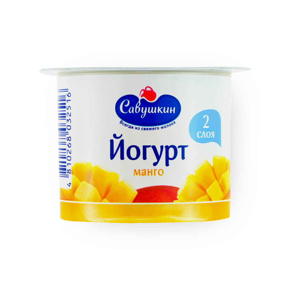 Состав: изготовлен из молока нормализованного пастеризованного, фруктового наполнителя «Манго» (манго; вода; сахар; стабилизатор – дикрахмаладипат ацетилированный, пектины, гуаровая камедь; регуляторы кислотности – цитраты натрия, цитраты кальция; ароматизатор – «Манго»; краситель – каротины), сахара, сухого обезжиренного молока, комплексной пищевой добавки (стабилизаторы - дикрахмаладипат ацетилированный, гуаровая камедь; желатин) с использованием закваски.