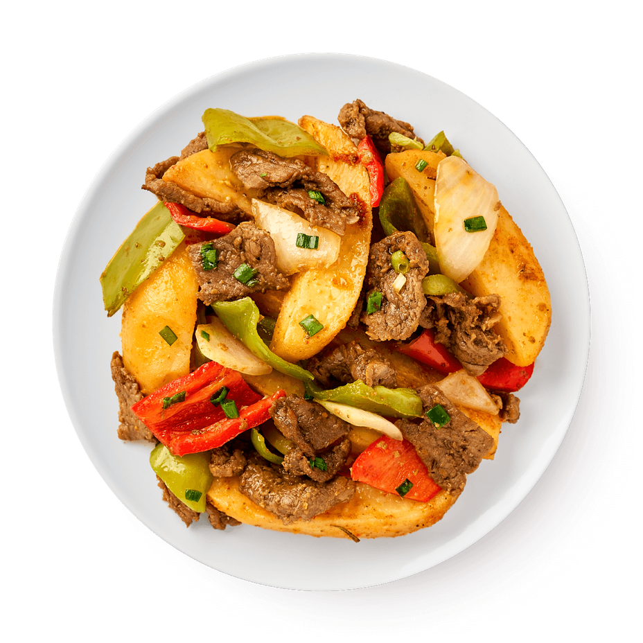 Картофель запечённый, жареное мясо с овощами (говядина маринованная (мясо говядина, яйцо, соус соевый, крахмал кукурузный, соль пищевая йодированная), лук репчатый, перец полугорький красный, перец полугорький зелёный, масло растительное, лук зелёный, соль пищевая йодированная, зира молотая).