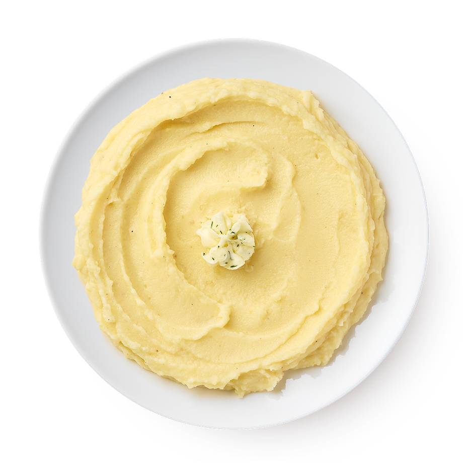 Это пюре приготовили с добавлением зелёного сливочного масла и укропа. Оно подойдёт в качестве гарнира к мясу или рыбе.