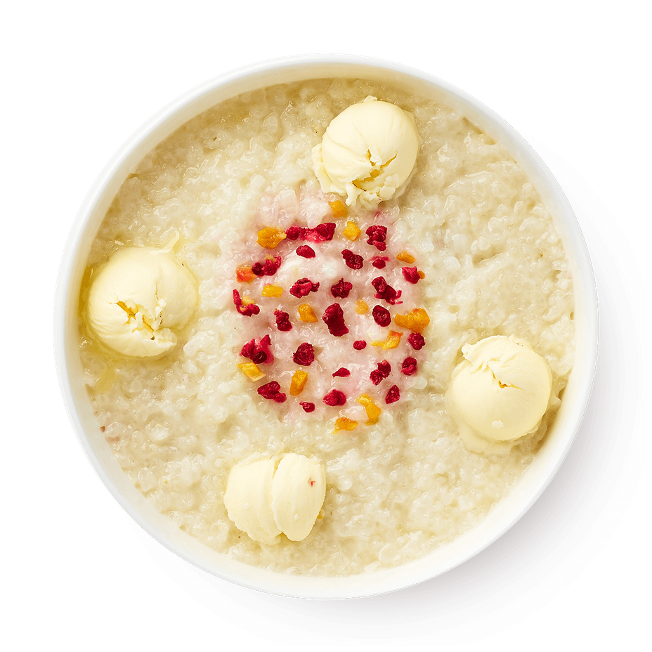 Крупа рис, молоко 2,5% жирности, масло сливочное 82% жирности, соль морская, сахар, ванильный экстракт, малина сублимированная, манго сублимированный гранулированный.