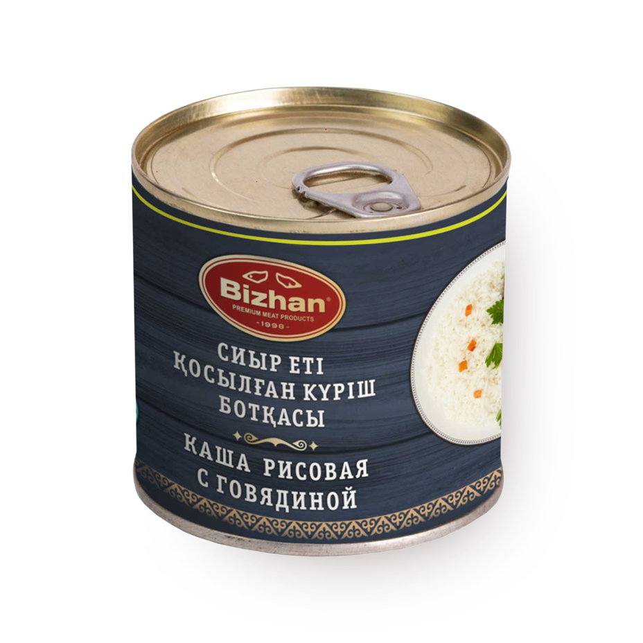 Говядина, крупа рисовая, жир сырец говяжий, соль поваренная пищевая, лук жареный, перец чёрный молотый.
