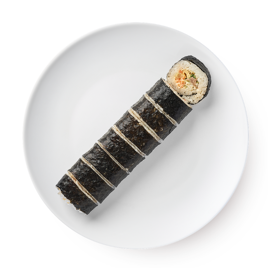 В этом кимпабе сочетаются рис с тунцом, морковью по-корейски и омлетом, который завернули в нори. Можно взять с собой на обед или подать в качестве закуски.