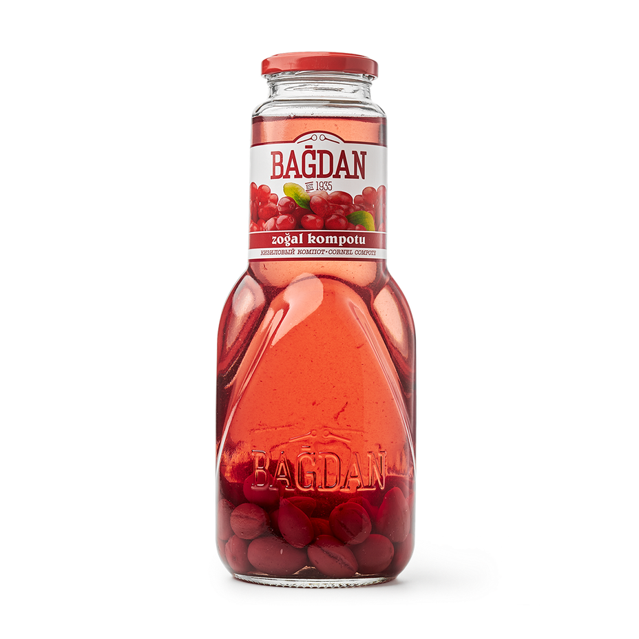 Этот компот приготовлен из кизила, который придаёт ему кисло-сладкий вкус. Можно пить охлаждённым или добавлять в десерты.