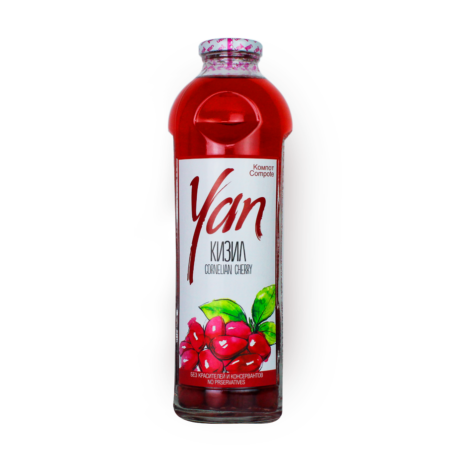Этот компот приготовлен из кизила с добавлением сахарного сиропа. Его можно пить охлаждённым или использовать для приготовления напитков.