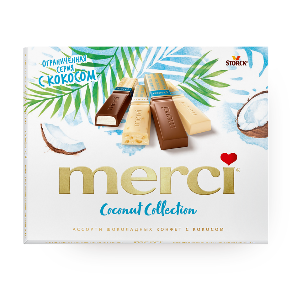 Шоколадная конфета «Темный шоколад с кокосовым кремом»: сахар, жир растительный, сливки сухие, какао тертое, масло какао, кокосовая стружка, молоко сухое обезжиренное, молоко сухое цельное, лактоза, эмульгатор соевый лецитин, ароматизаторы, соль. Шоколадная конфета «Белый шоколад с хрустящими кокосовыми хлопьями»: сахар, масло какао, молоко сухое цельное, кокосовая стружка, сливки сухие, молоко сухое обезжиренное, лактоза, кукуруза, пахта сухая, эмульгатор соевый лецитин, ароматизаторы, соль, экстракт ячменного солода. Шоколадная конфета «Молочный шоколад с кокосовым кремом»: сахар, жир растительный, молоко сухое цельное, масло какао, сливки сухие, какао тертое, кокосовая стружка, лактоза, молоко сухое обезжиренное, пахта сухая, эмульгатор соевый лецитин, ароматизаторы, соль. Шоколадная конфета «Белый шоколад с кокосовое-миндальным кремом»: сахар, масло какао, жир растительный, молоко сухое цельное, молоко сухое обезжиренное, сливки сухие, кокосовая стружка, жир молочный, дробленый миндаль, лактоза, эмульгатор соевый лецитин, ароматизаторы, соль. Продукт может также содержать фундук, арахис, другие виды орехов, яйца.
