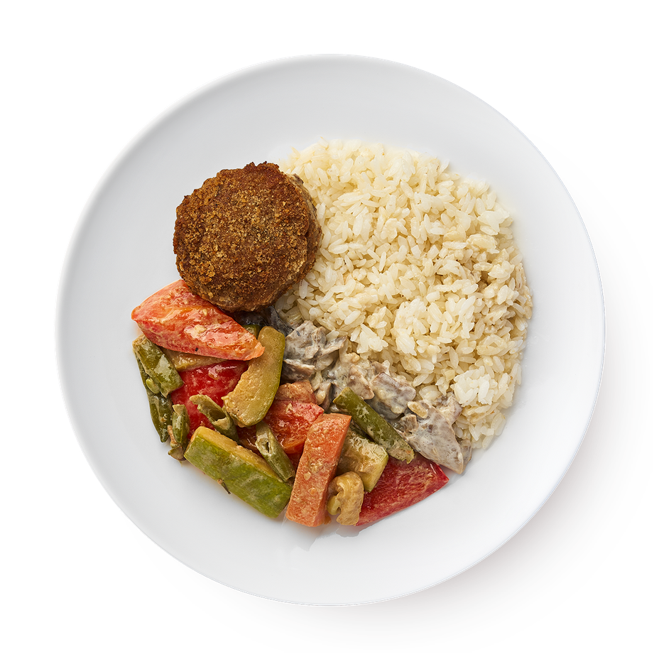Эта котлета сочетает говядину с курицей и подаётся с рисом, овощами и грибным соусом. Можно разогреть в микроволновке или на сковороде.