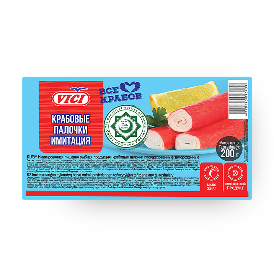 Сурими (фарш из зоологических видов рыб: красный нитепёр (Nemipterus japonicus), желтополосая сардинелла (Sardinella gibbosa); влагоудерживающий агент: полифосфаты); вода; крахмал пшеничный; крахмал кукурузный; масло растительное; загустители: дикрахмалфосфат, глицерин; сахар; соль; белок яичный; ароматизаторы; стабилизатор: каррагинан; эмульгаторы: Е 473, Е 322; краситель: ликопин; антиокислитель: аскорбиновая кислота.