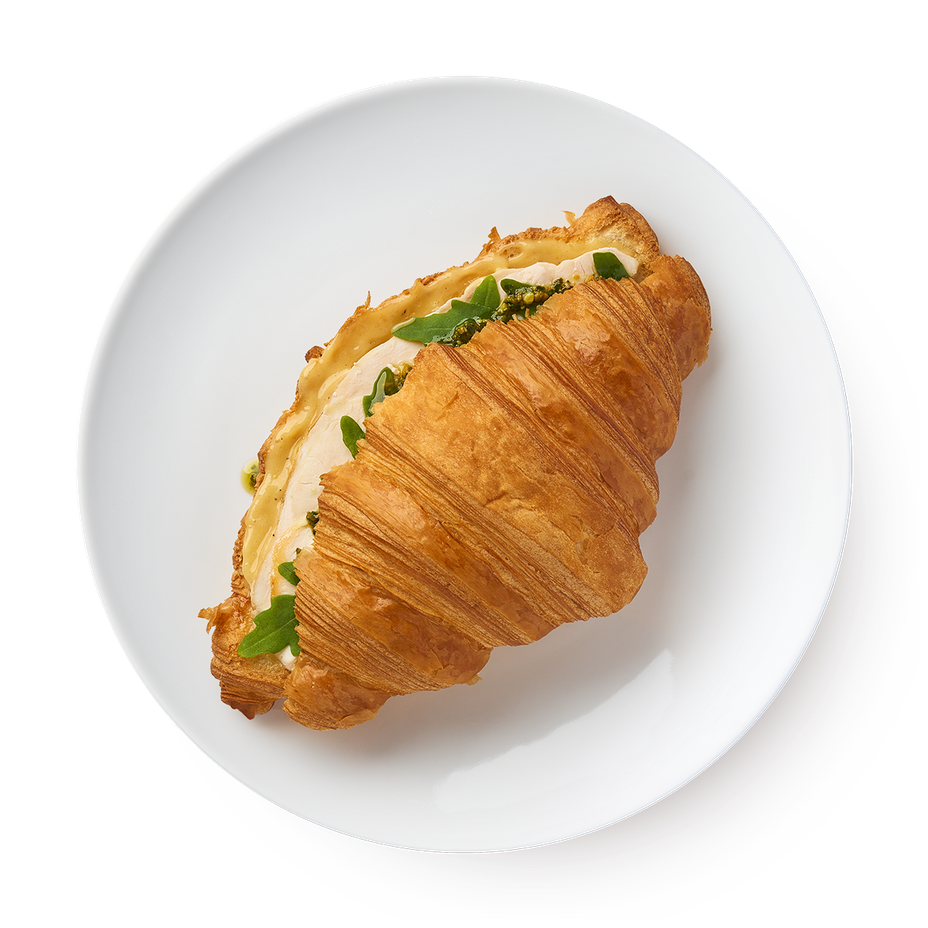 Этот круассан с куриным филе дополнен соусом песто и свежей рукколой. Его можно взять с собой на перекус или съесть в качестве лёгкого обеда.