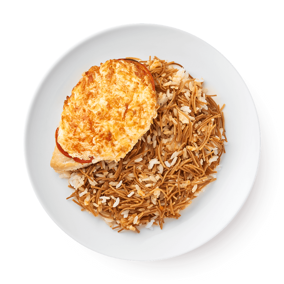 Куриное филе с сыром дополнено рисом и паутини, которые приготовили с томатной зажаркой. Это блюдо можно разогреть и подать на обед или ужин.