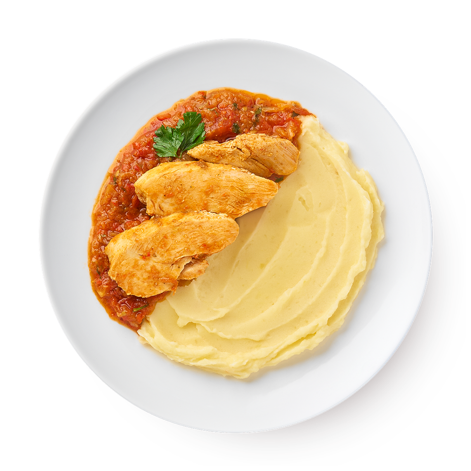 Картофельное пюре: картофель, сливки, масло сливочное, соль пищевая йодированная; Соус чахохбили (помидор, перец болгарский, лук репчатый, масло растительное, чеснок, кинза, соль пищевая йодированная, сахар, хмели-сунели, кориандр, паста томатная, перец чили); Филе куриное запеченное (филе куриное, масло растительное, соль пищевая йодированная, тимьян, чеснок, паприка); Кинза.