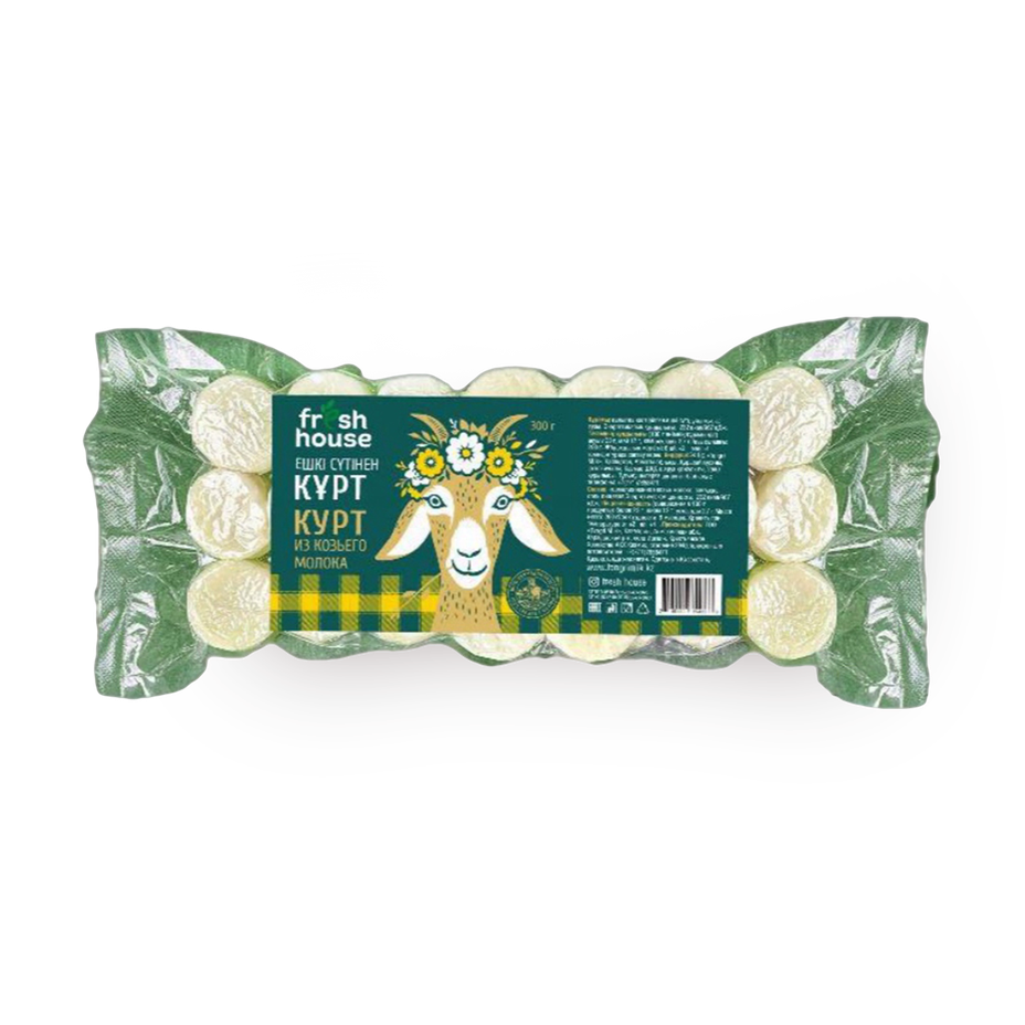 Этот курт из козьего молока имеет плотную текстуру и лёгкую солоноватость. Его можно добавить в салаты или есть как самостоятельную закуску.
