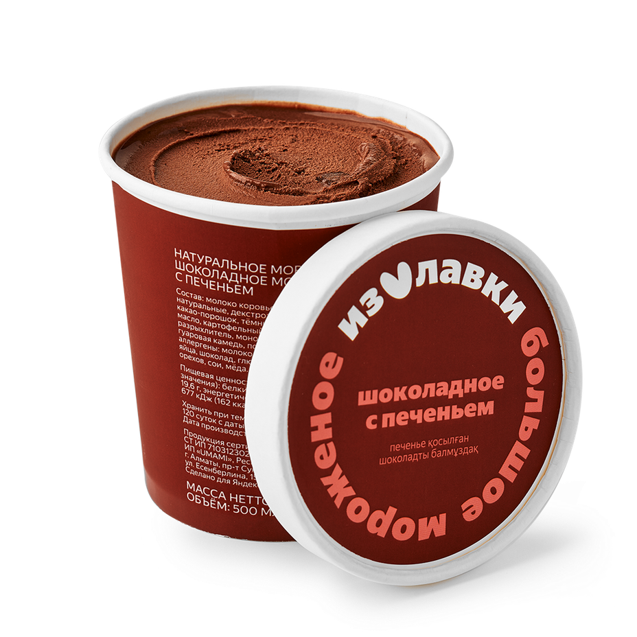 Молоко коровье натуральное, сливки натуральные, виноградный сахар, какао-порошок, тёмный шоколад, гуаровая камедь, печенье.