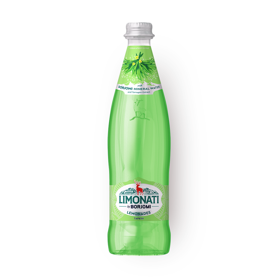 Природная питьевая вода из родников Боржомского ущелья, вода минеральная природная лечебно-столовая питьевая «Боржоми», сахар, концентрированный яблочный сок (7.8%), яблочный сок (1.39%), концентрированный лимонный сок (0.88%), регуляторы кислотности лимонная кислота и аскорбиновая кислота, краситель медные комплексы хлорофиллинов, экстракт тархуна. Не содержит синтетических красителей и консервантов.