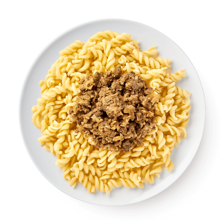 Спиральные макароны с говяжьим и куриным фаршем, которые дополнены луком и чёрным перцем. Это блюдо можно разогреть и подать горячим.