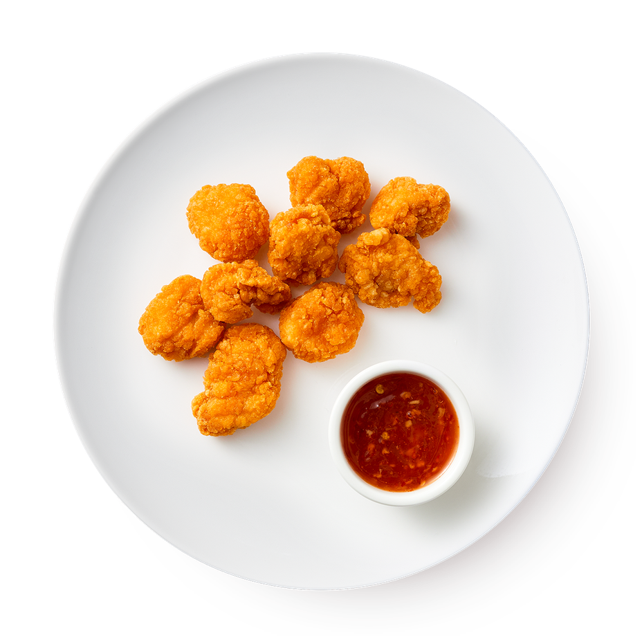 Попкорн куриный: мясо цыплёнка, мука пшеничная, масло растительное, вода питьевая, крахмал, соль пищевая, сахар, пряности.