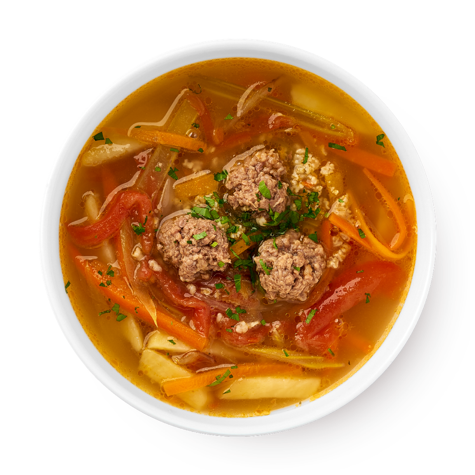 Лук репчатый, морковь, картофель, перец болгарский, сельдерей стебель, масло растительное, томаты, фарш говяжий, соль, перец чёрный молотый.