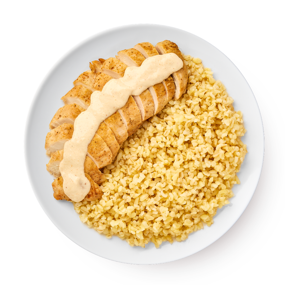Куриное филе, соль, перец чёрный, горчица, масло подсолнечное, крупа булгур, вода, соус (молоко, горчица, соль, паприка, перец чёрный).