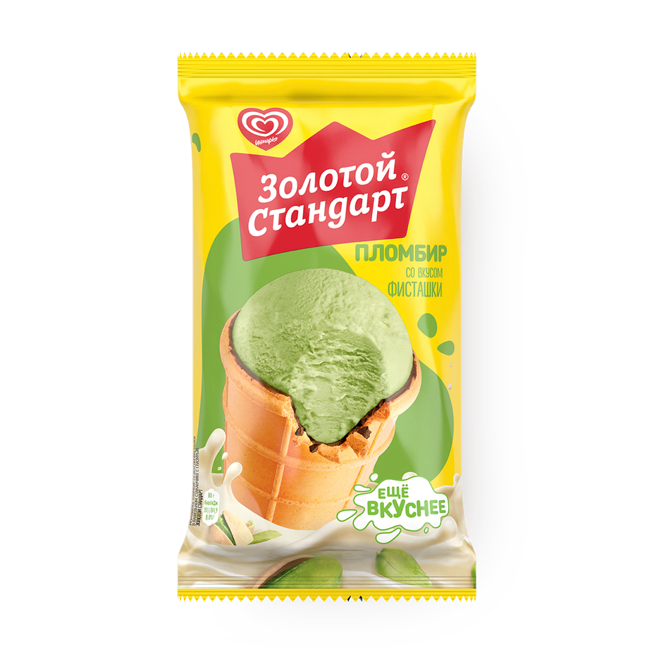 Этот пломбир с фисташкой в вафельном стаканчике сочетает сливочный вкус с лёгким ореховым оттенком. Можно есть ложкой или просто держать в руке.