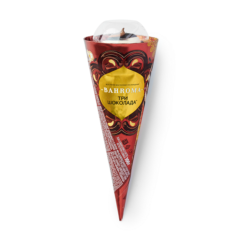 Этот пломбир сочетает три вида шоколада в сливочной основе. Вафельный рожок добавляет хрустящую текстуру.