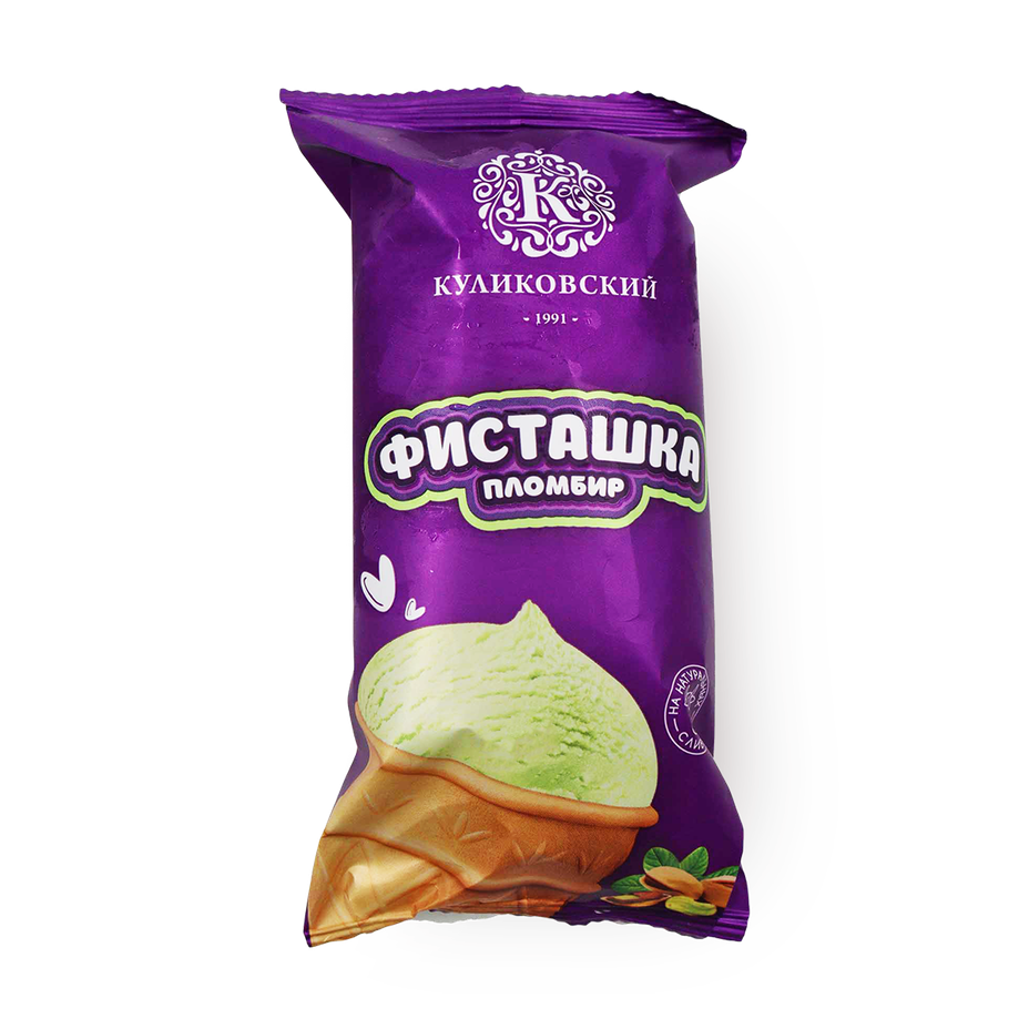 Этот пломбир приготовили с фисташковым пралине и сливками. Вафельный стаканчик делает его удобным для перекуса.